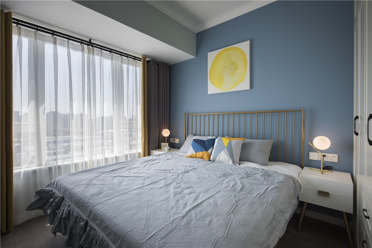 室內(nèi)主臥裝修案例,通過拆除主臥空間原有的飄窗來擴(kuò)大主臥空間,滿足兩個(gè)床頭柜的需求。