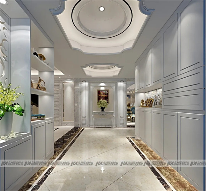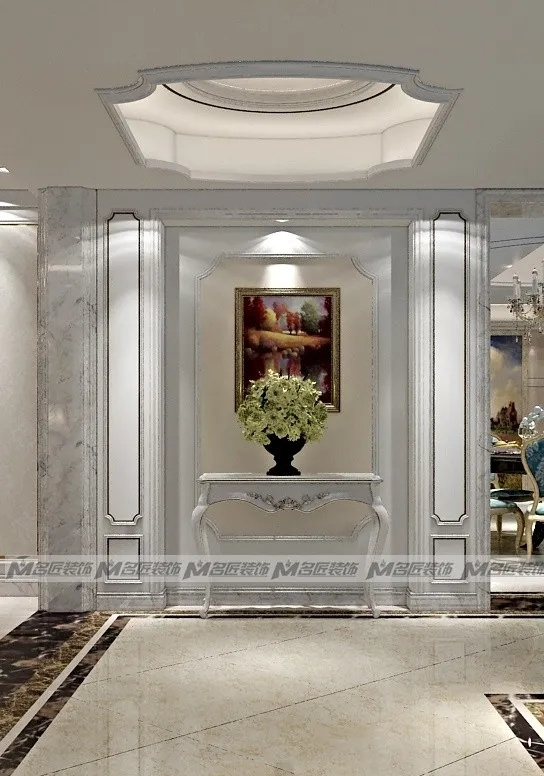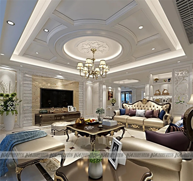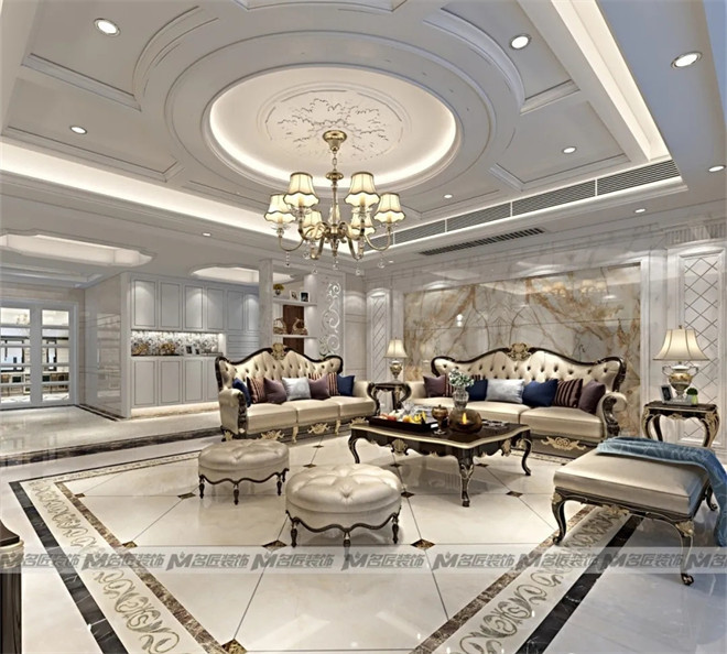 花紋對稱的金色大理石沙發墻面,線條對稱的白色窄框石膏線,以及復古的臺燈、擺飾,都展現出空間的規律美感,在視覺上達到平衡。造型古典的彎腿式沙發,華麗的吊燈,精美的雕花鏤空隔斷,別致的拼花地磚,塑造出高貴典雅從容的居住空間。