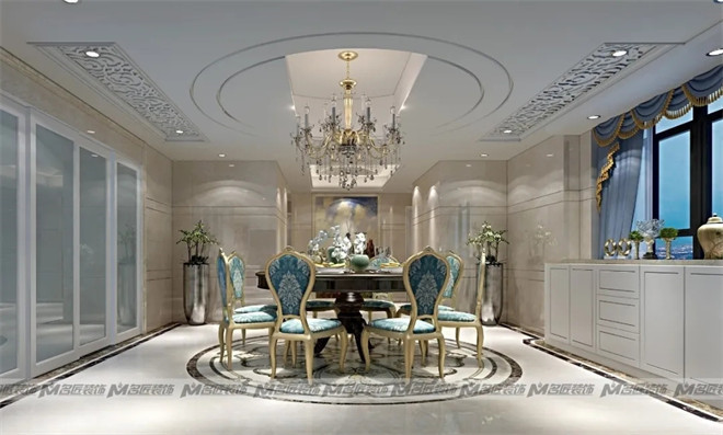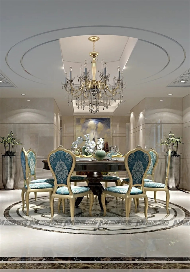 湖綠色復古花紋的餐桌椅儼然是餐廳的主角,優雅氣派,明亮璀璨的水晶吊燈烘托出浪漫溫馨的用餐氛圍,天花板的極簡圓形線條與雕花線條相輔相成,在裝飾上盡顯華麗!
