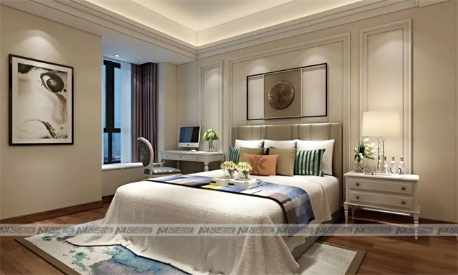 臥室整體色彩靜謐沉穩,延續米白色的主色調,搭配棕色的木質地板、藍白相間的幾何圖案地毯,象牙白色的床頭柜,黃銅金屬色的壁燈及油畫,從整體到局部,都給予人更深印象的層次感。