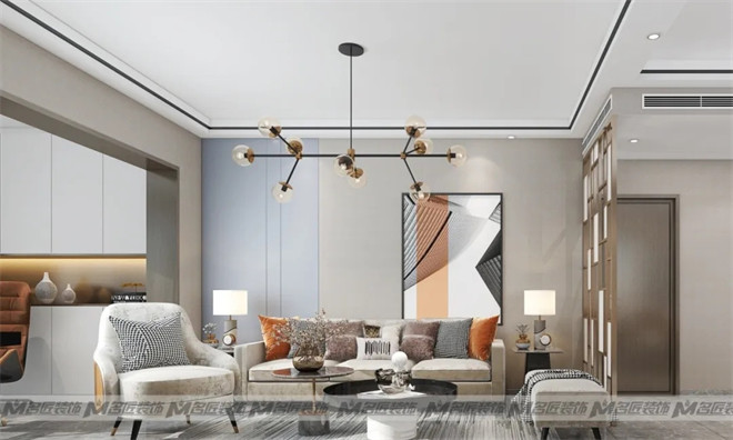 目之所及處,被淺咖色包裹住的客廳散發出優雅大氣的高級意味。軟裝搭配是設計的靈魂,加入了少許橘色點亮眼眸,空間環境瞬間有了時尚精致感。