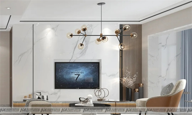 大理石電視背景墻,絲絨質地的沙發,輔以窗簾、幾何掛畫、圓形邊幾、擺件等軟裝搭配,不同材質之間相互碰撞,又相輔相成,畫面一派和諧。