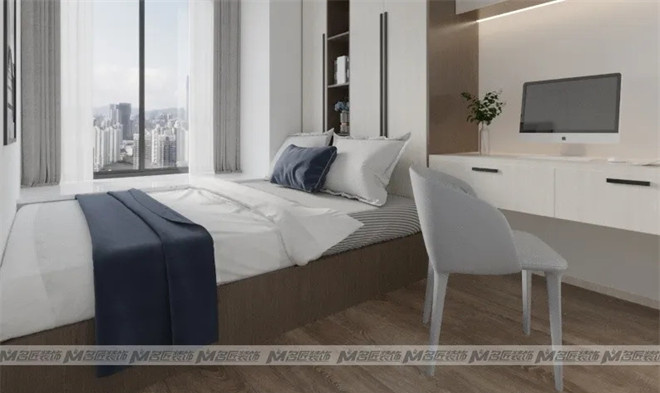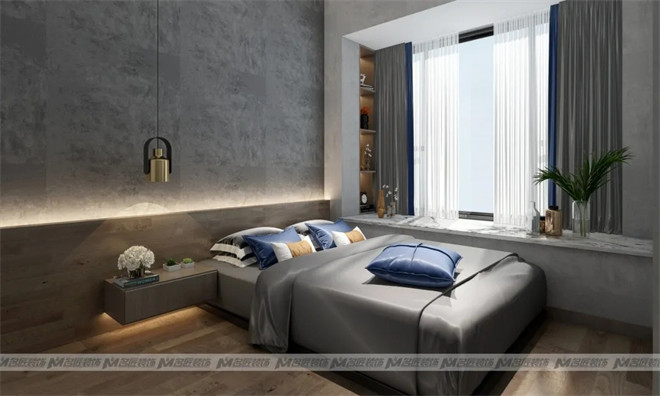 步入臥室,以木質背景墻做滿床頭,搭配前衛的裝飾畫,北歐風灰色調墻布,立體吊燈點綴,整體自然協調。清晨的陽光從窗戶透進來,灑在了潔白的被子上,這片刻的溫柔令人沉醉。