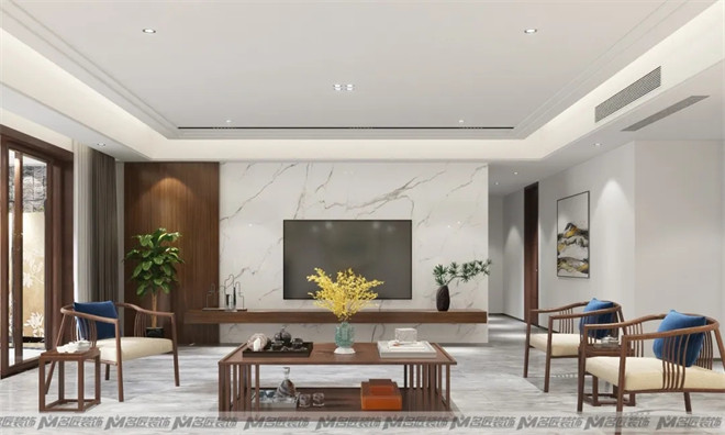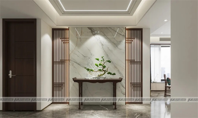 將中國文化延伸到家居文化當中,既符合現代審美又保留東方美學及其文化精髓。原木柵欄的玄關,線條簡潔利落,佈局對稱端莊,在整片的大理石背景墻襯托下,意境雅緻優美,靜謐空靈。