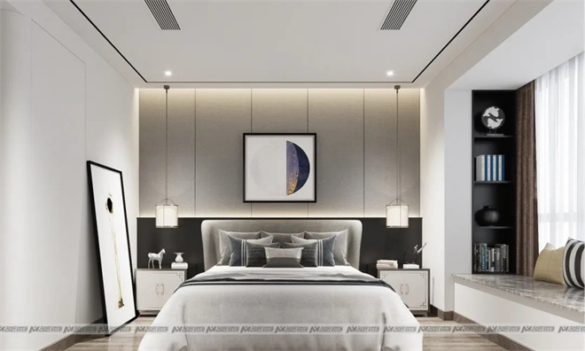 相比於主臥的沉穩儒雅,次臥更淡然素凈,靜謐的灰是空間的主調,與自然紋路的木地板一呼一應,烘托出臥室的恬靜溫馨,床頭兩盞對稱的吊燈透出柔和的光芒,藝術擺件點綴空間,環環相扣,東方遇上現代,恰到好處地演繹出現代中式美學。