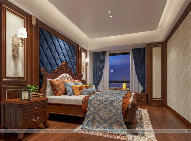 主臥設(shè)計(jì)讓人肅穆,墻面采用米黃色的經(jīng)典歐式花紋墻紙裝飾,高檔的藏藍(lán)色啞光軟包床頭背景墻,尊貴與格調(diào)不言而喻。