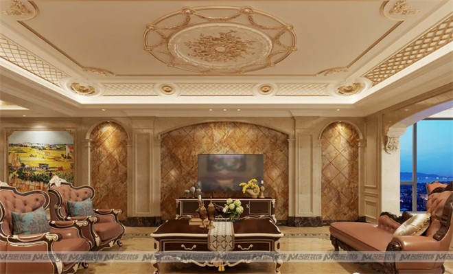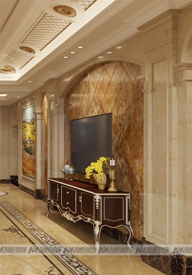 客廳的墻面大面積地使用米黃色系的石材來裝飾,與大理石拼花的地面相映成輝,石材天然的紋理使空間多了一份自然純粹。深色的皮質(zhì)沙發(fā)是客廳的主角,古樸典雅,藝術(shù)感濃厚。不僅帶來感官上的平衡舒適,更帶有莊重感。暖黃色的燈光在石材的反射下,整個空間流光溢彩,華貴絢麗。