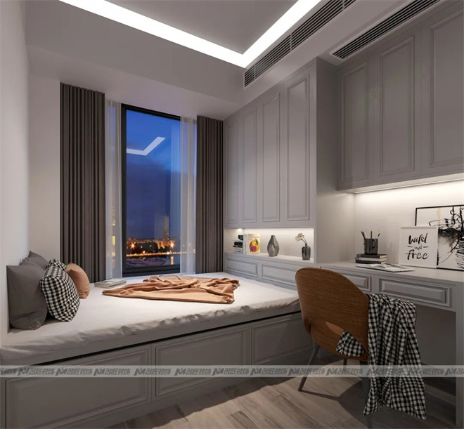 長輩房的設(shè)計(jì)風(fēng)格偏向現(xiàn)代簡約,整體呈現(xiàn)自在平和的舒適氛圍,以白色作為主要色調(diào),明亮干凈,給老人創(chuàng)造一個樂觀積極的居住環(huán)境。