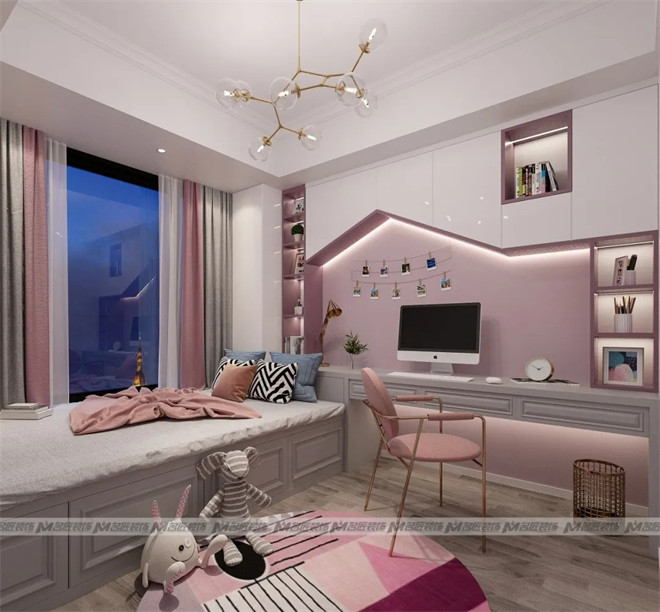 粉色大概是每個寶藏女孩都無法抗拒的顏色了,其自身夢幻浪漫、甜蜜柔美的氣質(zhì)尤為吸引人。粉色的墻體與定制化的白色書柜相結(jié)合,滿足了收納與學(xué)習(xí)需求,照片墻滿載著小女孩美好的回憶。