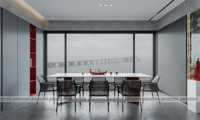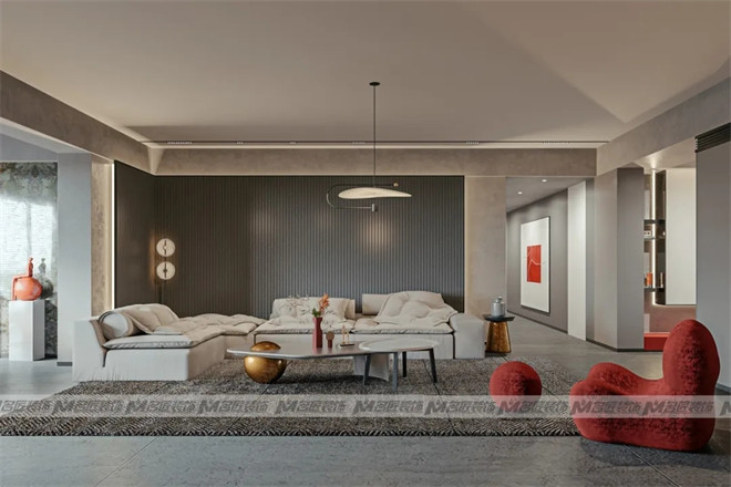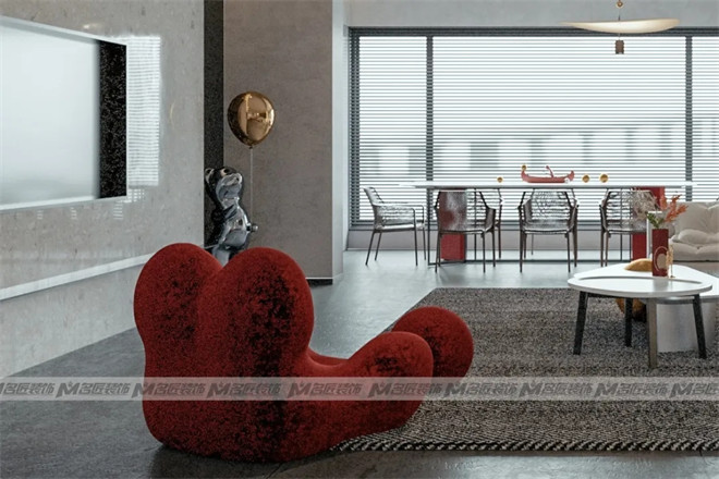客廳與觀景陽臺相連,大面積的長虹紋玻璃墻,帶來良好的采光,延伸視覺效果,擴大空間感。再添入一抹朱紅,驚艷了時光。