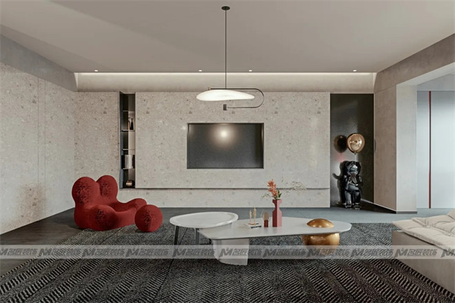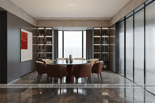整個客廳充斥著高級而又格調的氛圍感,無主燈設計,將燈帶、磁軌燈、壁燈等進行組合,兼顧墻、頂、地三面的照明訴求。電視背景墻是一面水磨石墻,其自然豐富的肌理紋路與空間里的其他色塊不謀而合,締造出一種低調細膩的美感,豐富感官體驗。沙發背景墻選擇了啞光烤漆板,設有隱藏式燈帶,緩緩漸變的輕柔光暈,中和了高級灰烤漆板的冰冷,精致的圓形壁燈加以點綴,減少墻面的單調。