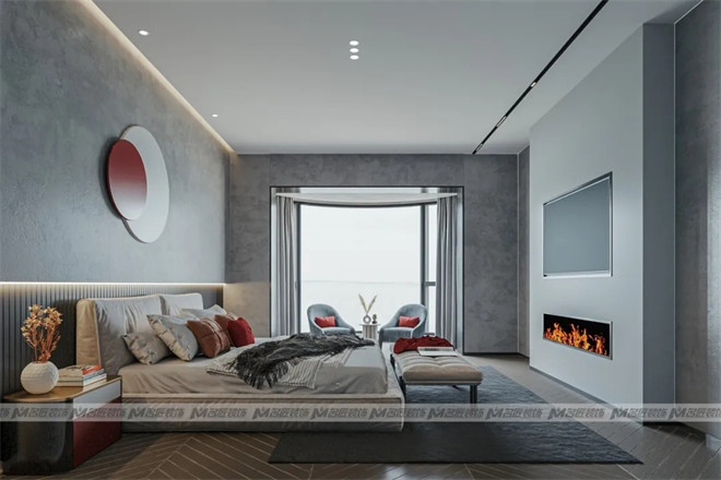 主臥以高級灰作為肌底,純粹內斂的質感給予人情緒上的安撫,注入紅色軟裝,出現在裝飾畫、抱枕、床頭柜上,將張揚與低調銜接和諧,凸顯優雅格調。