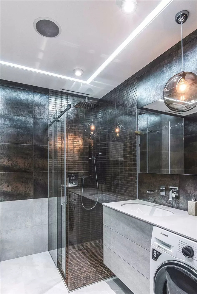 灰色衛生間,很有肌理感,搭配很有藝術氣氛的燈,給人的感覺很純凈自然也不乏現代時尚質感。