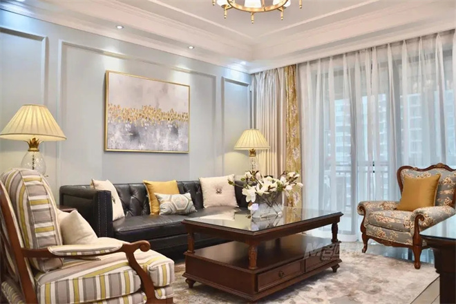 客廳布藝沙發混搭皮質沙發,淺藍色的基調用金色點綴,富麗的窗簾打造出優雅溫柔