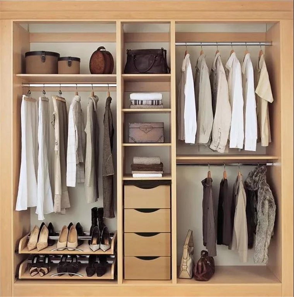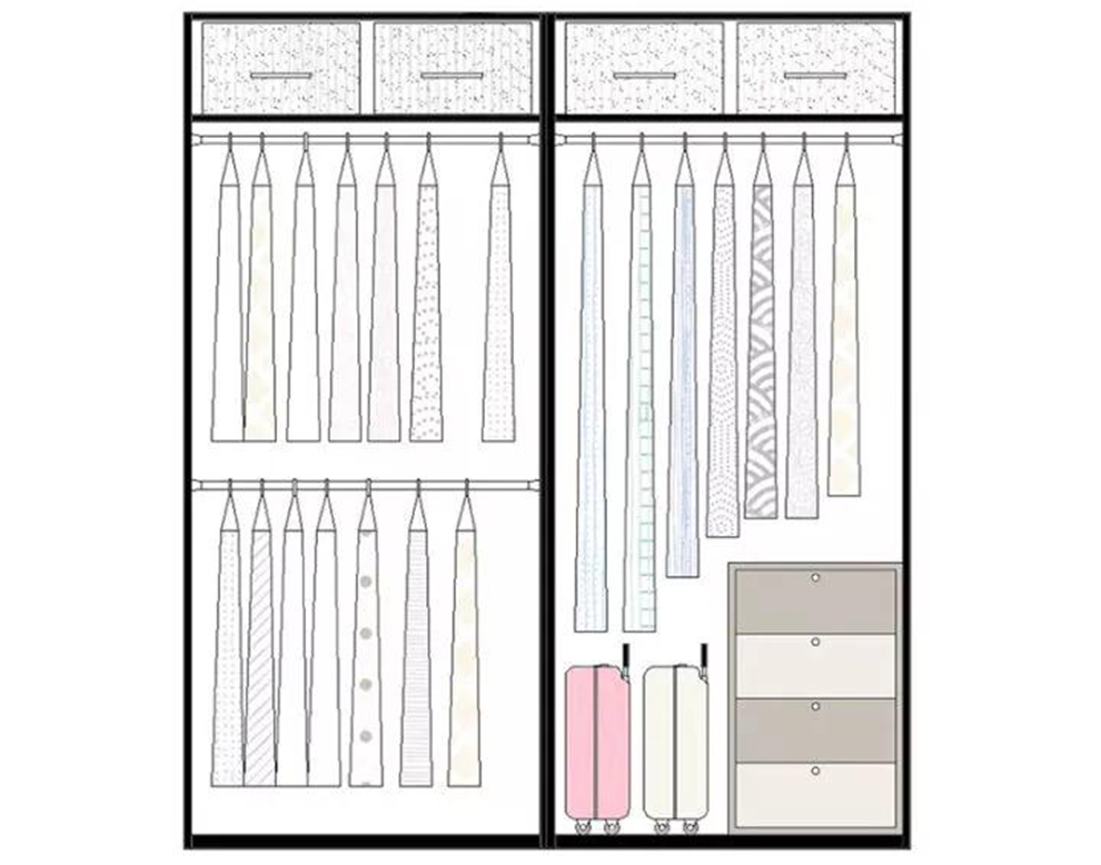 2.?衣物長短不一,所以掛衣區下方最好不要規劃太多抽屜、隔板,后期在比較短的衣物下方放置收納盒,擺放不適合懸掛或需要細心保存的衣物,空間更加靈活,利用率更高。
