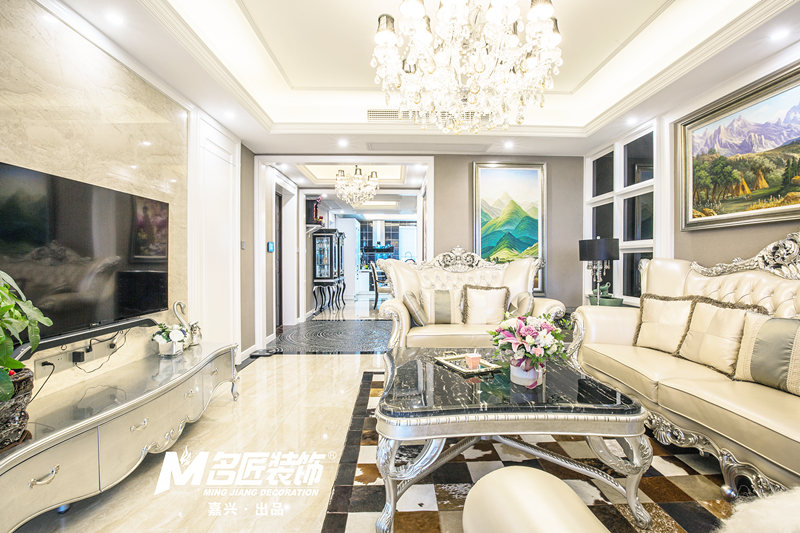 客廳沒有復雜的隔斷,整體色調以灰、金、黑為主,展現新古典主義低調的奢華,然后糅合少量白色使空間看起來更明亮、高貴。