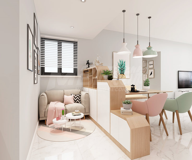 小戶(hù)型裝修時(shí)我們推薦選用矮腳、細(xì)腳的家具,降低空間重心,和不吊頂是一個(gè)道理。線(xiàn)條不要復(fù)雜,比如說(shuō)隔斷,少用鏤空,多用直線(xiàn)條、木柵格。