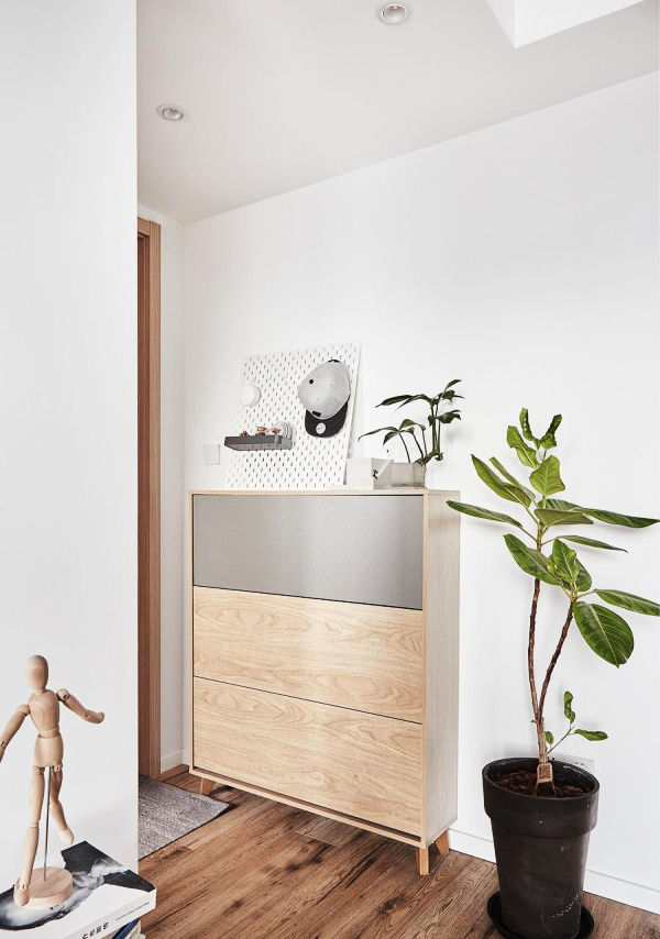 沒有玄關且空間不大的情況,做大柜子就會阻礙空間動線,建議采用小型柜體隔斷,讓沒玄關的戶型隔出一個玄關空間的同時又增加收納功能。