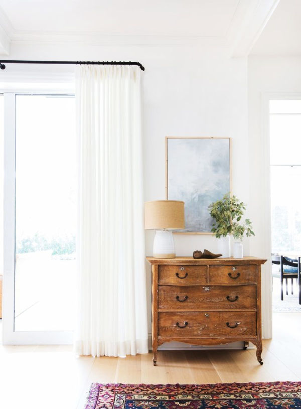 如果入戶后正對一堵墻,餐廳和客廳分據在入戶門的兩側,而且左右墻面沒有空間做柜子,便可以在正對面的墻靠邊擺放一個小收納柜。