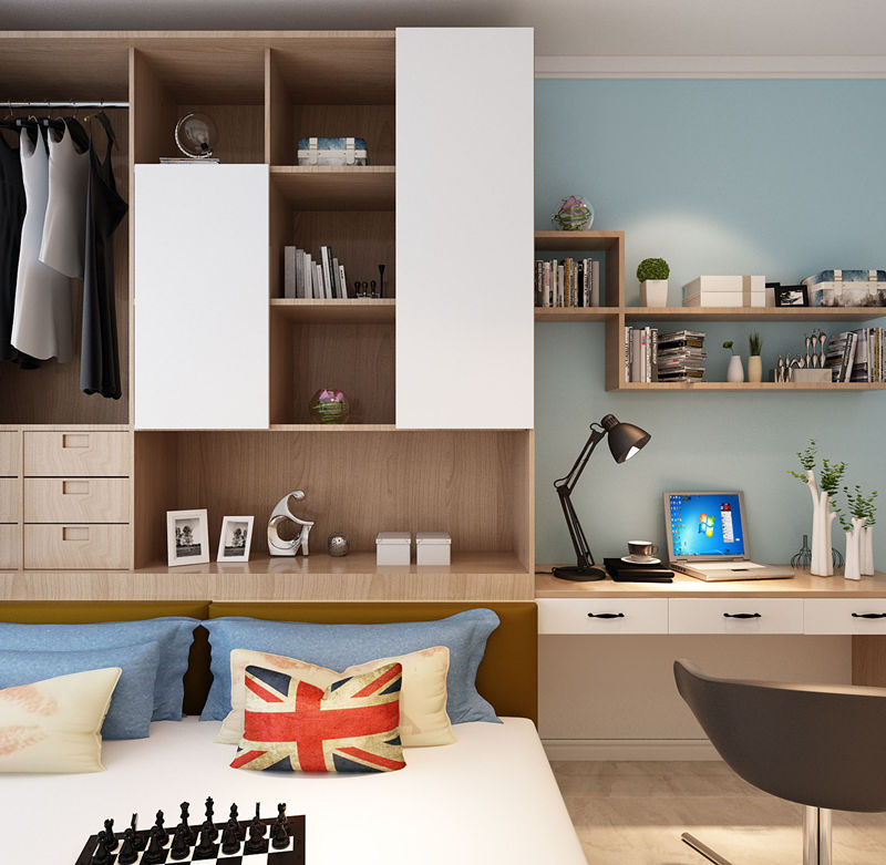 你也可以在臥室中量身定制一個(gè)組合式衣柜,然后就勢(shì)利用上衣柜的一邊設(shè)計(jì)成書(shū)架書(shū)桌。相較一成不變的書(shū)架,這種不同大小的分格更容易收納尺寸不一的書(shū)籍畫(huà)冊(cè)和飾品,使它們井然有序,書(shū)桌更加整潔。