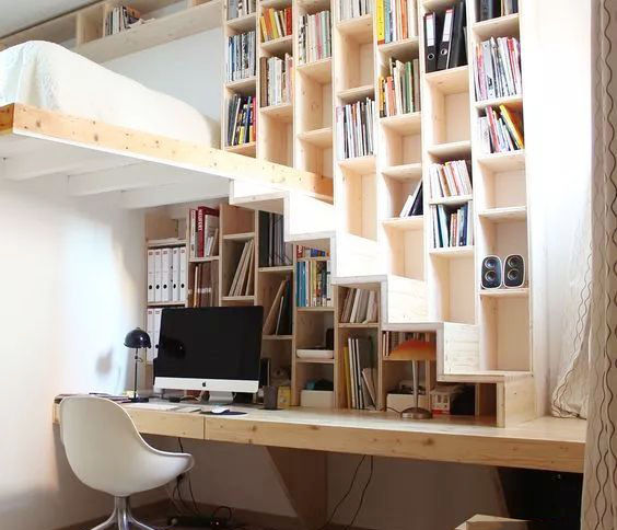 此結(jié)構(gòu)有點(diǎn)類(lèi)似大學(xué)宿舍,同一空間,下層是書(shū)柜書(shū)桌,上層是臥床,想一想這樣的布局還讓人有點(diǎn)小懷戀。