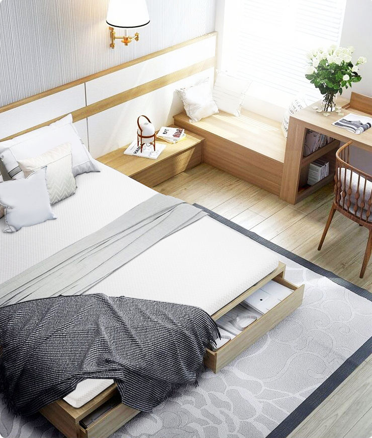 房間極小,不論放什么都只剩轉(zhuǎn)身的位置,直接做成榻榻米房間吧。在臨床位置布置書(shū)桌,榻榻米中部做地臺(tái),尾部與衣柜垂直組合,整個(gè)首尾相連,塑造出一種具有沉浸感的效果。