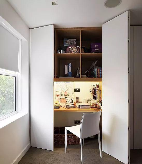 想要一個(gè)又個(gè)性又私密的書(shū)房嗎~如果你夠大膽的話,可以將書(shū)房“塞”進(jìn)柜子里,一關(guān)上柜門(mén)就隱藏不見(jiàn)。這種設(shè)計(jì)能讓你的閱讀空間和臥室完美融合且互相獨(dú)立,用最省事的方式就能讓房間保持整齊,關(guān)上門(mén)一招致勝。