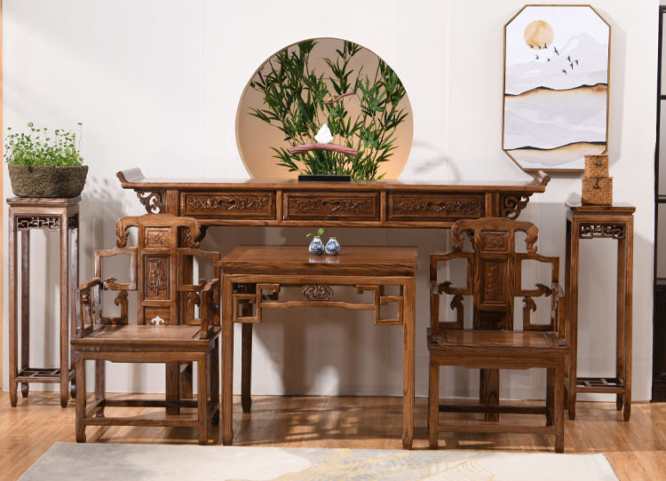中堂家具除了擺放要求和諧對稱,形體也大多莊重壯實,在桌子牙板和太師獅的扶手、靠背上,還常見精心雕刻的龍鳳、卷草、靈芝等紋飾,寄托美好的寓意。