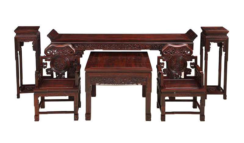 這六件套包含長條案、八仙桌和扶手椅/太師椅、花架,一般以廳的中軸線為基準對稱擺放。