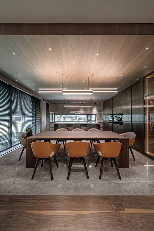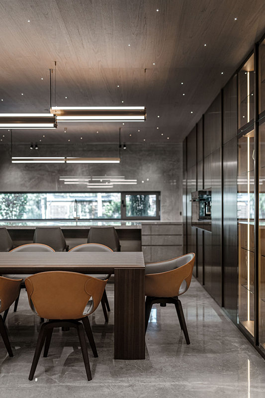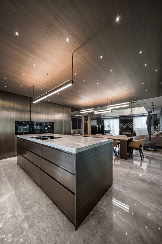 只見有無數柔和的光芒,像鉆石,又像星星,無序的點綴在木制天花上。美輪美奐,低調奢華,下方的就餐區與烹飪區開放融為一體,在動人的“星光”下接受洗禮。
