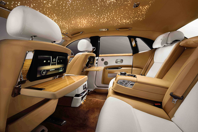 據說這個星空頂是由勞斯萊斯聘請技藝精湛的工匠,花9個多小時純手工打造而成,夜晚開車時,只要打開車頂的燈光,就可以讓人仿佛暢游于星光閃爍的夜空下。