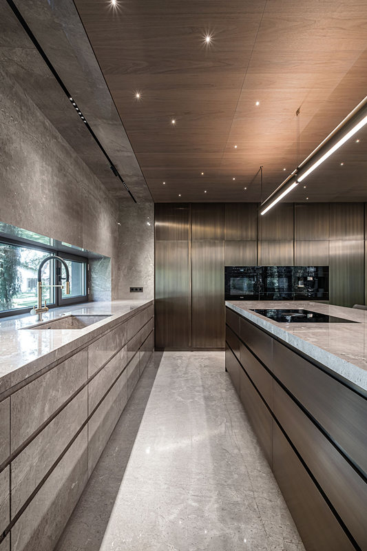 金屬拉絲櫥柜大膽前衛,紋理細膩,搭配嵌入式烤箱,為廚房省出更多臺面的操作空間。