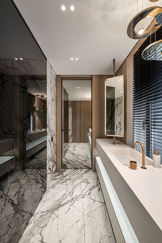 盥洗區的鏡子門后隱藏著“秘密空間”馬桶及淋浴區,前面地面均以大理石裝飾,方便清理。內嵌筒燈不占據空間,減少壓迫,同時又很好地營造出溫馨感。