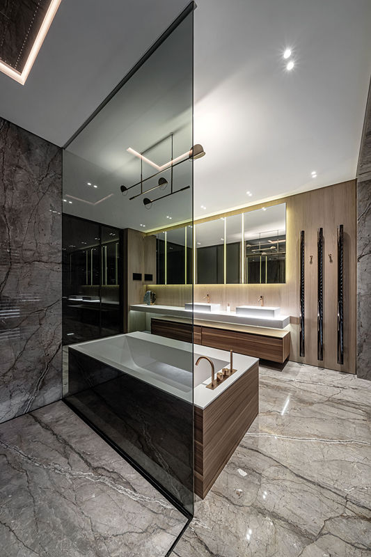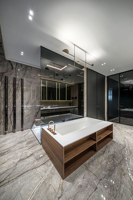 衛浴的石材最終選擇了源自巴西高端進口奢石——“巴塔哥尼亞”來奠定整體基調。其紋理粗獷、野性、生動,同時又具有極強的空間裝飾性。
