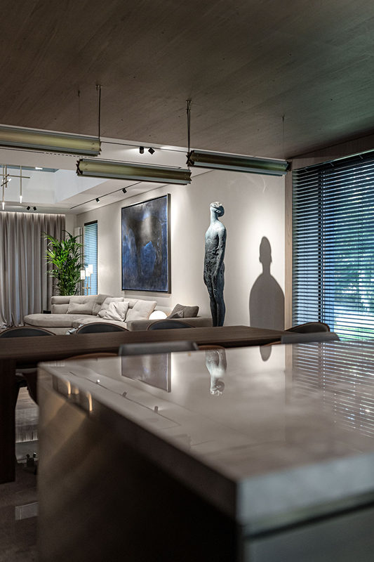 石材和金屬自帶誘人的光澤,在點點燈光的映襯下,扎實中透露出靈動,提升了整個家的氣質與品位。