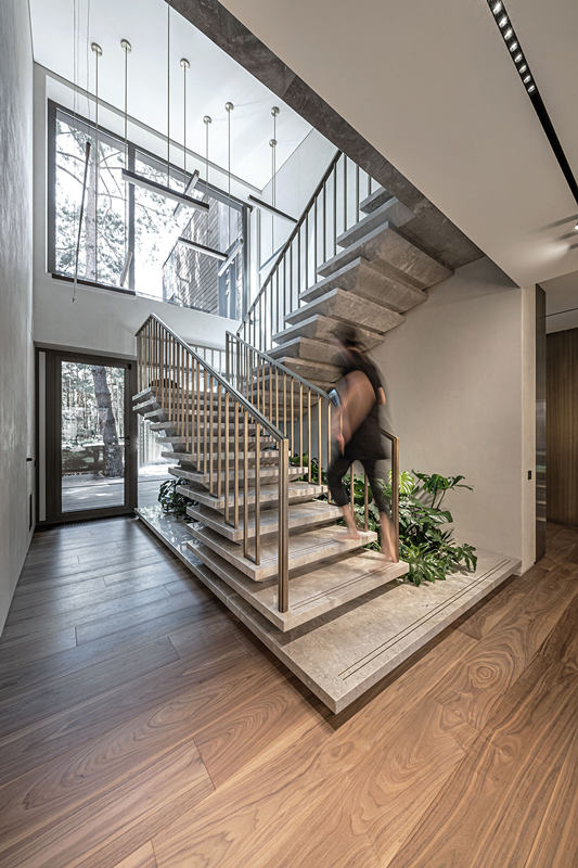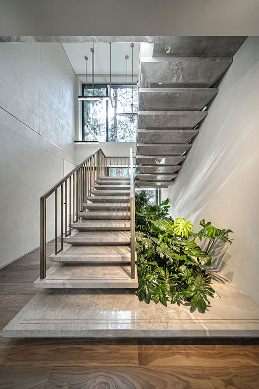 仿照梯田設計的樓梯蜿蜒而上,緩和平坦,走在上面十分具有安心感,下方的空地點綴上綠植,別有一番自然風情。